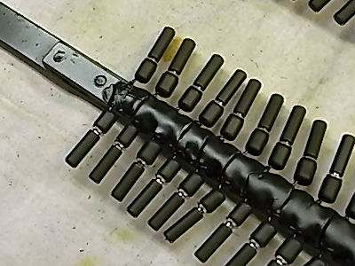鉄の棒にずらりと付いた松葉に、部品をどんどんつけていけば、棒状に部品が鈴なりに付いたモノが出来上がります。