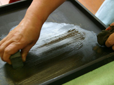 | 塗り: 採取された漆液は濾過、精製され、器などに塗られます。 器の素材は当然木製が中心ですが、漆自体は素材を選ばず金属やガラスなどに塗ることも可能です。 塗りは下塗り、中塗り、上塗りを各3回程度ずつ、合計10回近くの重ね塗りを行います。 下塗りはへら、中塗り、上塗りは特殊な刷毛が使われます。 |